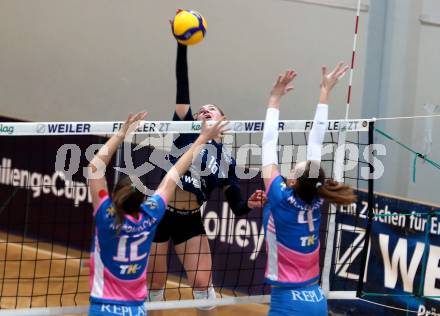 Volleyball. Challenge Cup 2022/23. ATSC Kelag Wildcats Klagenfurt gegen VK Prostejov.   Magdalena Rabitsch (Wildcats),   Petra Kozouskova, Sona Novakova (Prostejov). Klagenfurt, 23.11.2022.