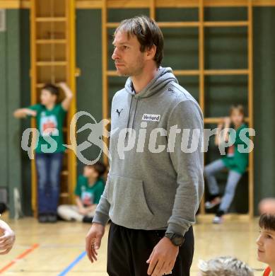 Futsal Schuelerliga. Finale. BRG Spittal (gruen) gegen Waidmannsdorf (blau). Trainer (Spittal). St. Veit an der Glan, am 22.2.2023.