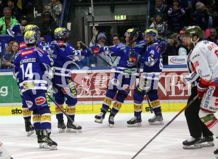 EBEL. Eishockey Bundesliga. EC VSV gegen HCB Suedtirol Alperia. Torjubel Alexander Rauchenwald, Philipp Lindner, Johannes Tschurnig, Alex Wall (VSV). Villach, am 9.3.2024.