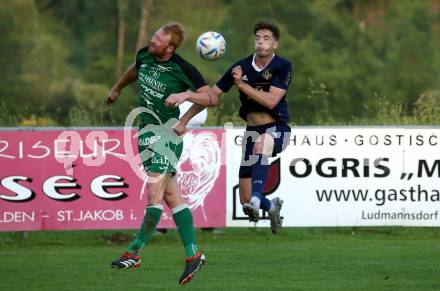 Fussball Kaerntner Liga. Velden gegen Lendorf. Nicolas Manuel Modritz (Velden), Christian Wernisch (Lendorf). St. Egyden, am 7.6.2024.
