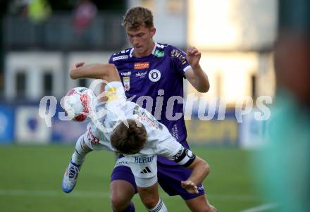 Fussball Bundesliga. WAC gegen SK Austria Klagenfurt. Dominik Baumgartner, (WAC), Nicolas Binder (Klagenfurt). Wolfsberg, am 3.8.2024.