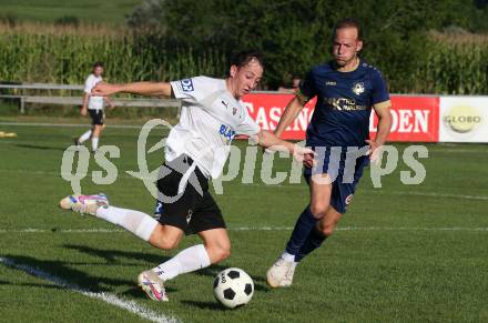 Fussball Kaerntner Liga. Velden gegen Bleiburg. Mario Kroepfl (Velden), Matheo Pichler (Bleiburg). St. Egyden, am 24.8.2024.