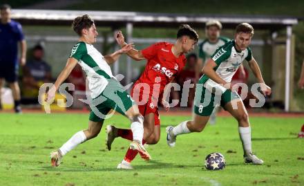 Fussball Kaerntner Liga. Voelkermarkt gegen ATSV Wolfsberg. Raphael Lukas Kulterer, Lukas Urnik (Voelkermarkt),  Denin Begic  (Wolfsberg). Voelkermarkt, am 30.8.2024.