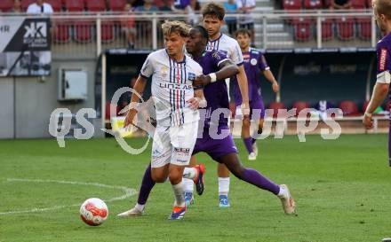 Fussball Bundesliga. SK Austria Klagenfurt gegen FC Blau Weiss Linz. Dikeni-Rafid Salifou, l (Klagenfurt), Alexander Bried (Linz). Klagenfurt, am 31.8.2024.