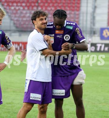Fussball Bundesliga. SK Austria Klagenfurt gegen FC Blau Weiss Linz. Simon Straudi, Dikeni-Rafid Salifou (Klagenfurt). Klagenfurt, am 31.8.2024.