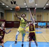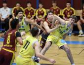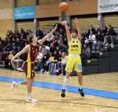 Basketball 2. Liga 2025/2026. Grunddurchgang 7. Runde. Woerthersee Piraten gegen Traiskirchen Lions NexGen. Marcus Holyfield , Andreas Nuck, David Jelkic (Piraten), Jamie Onyemaechi, Herohii Tverdokhlibov (Traiskirchen). Klagenfurt, am 15.11.2025.