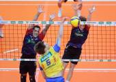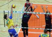 Volleyball Bundesliga. AVL. Austrian Volleyball League. Aich/Dob gegen VBK Kelag Woerther-See-Loewen Klagenfurt. Jiri Srb (Aich/Dob), Jonas Emanuel Holzinger, Ben Stockhammer (VBK Klagenfurt). Bleiburg, am 15.11.2025.