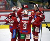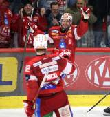 Eishockey ICE Bundesliga. Winn2day ICE Hockey League. KAC gegen Hydro Fehervar AV 19. Torjubel Filip Simovic, Clemens Unterweger, Mathias From (KAC). Klagenfurt, am 16.1.2026