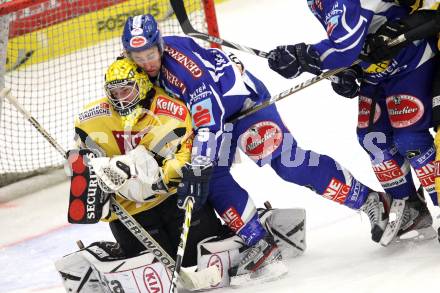 EBEL. Eishockey Bundesliga. EC Rekord Fenster VSV gegen UPC Vienna Capitals. Tomaz Razingar, (VSV), Sebastian Stefaniszin (Caps). Villach, am 21.10.2011.
