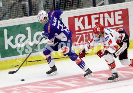 EBEL. Eishockey Bundesliga. EC VSV gegen HC TWK Innsbruck. Adis Alagic, (VSV), Johan Bjoerk (Innsbruck). Villach, am 19.9.2014.