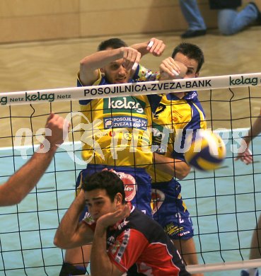 Volleyball Bundesliga. SK Aich/Dob gegen Hypo VBK Klagenfurt. Jure Kokot und Miha Kosl (Aich/Dob) und Fernando Morales. Bleiburg, am 12.11.2005.