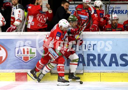 EBEL. Eishockey Bundesliga. KAC gegen HCB Suedtirol Alperia. Stefan Geier (KAC), Massimo Carozza (Bozen). Klagenfurt, am 17.3.2019.