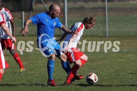 Fussball Kaerntner Liga. Woelfnitz gegen Bleiburg. David Tamegger, (Woelfnitz), Dejan Geric (Bleiburg). Woelfnitz, am 23.3.2019.