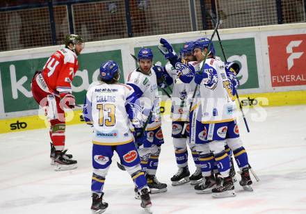 EBEL. Eishockey Bundesliga. VSV gegen HCB Suedtirol Alperia. Torjubel Collins Chris, Maxa Felix, Zauner Sebastian (VSV). Villach, am 22.12.2020.