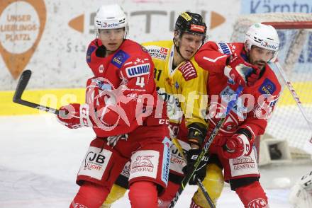 EBEL. Eishockey Bundesliga. KAC gegen spusu Vienna Capitals. Kele Steffler, Thomas Koch, (KAC), Marco Richter (Vienna Capitals). Klagenfurt, am 22.12.2020.