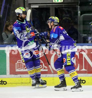 Eishockey ICE Bundesliga. VSV gegen HCB Südtirol Alperia. Torjubel Patrick Holway, Daniil Kulintsev, (VSV). Villach, am 12.1.2025