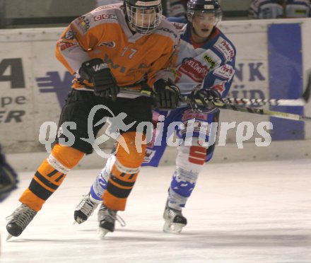 Eishockey Elite Liga. V?lkermarkt gegen Steindorf. Christofer Petritsch (V?lkermarkt), Alessandro Ranftl (Steindorf). V?lkermarkt, am 13.1.2007.